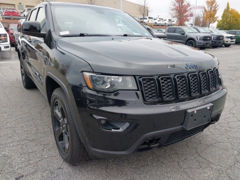 The 2019 Jeep Grand Cherokee Upland Edition in Diamond Black Crystal Pearlcoat is a rugged yet refined SUV, built for both city streets and off-road adventures. Powered by a 3.6L V6 24V VVT engine with 4WD and a 3.45 rear axle ratio, it offers solid towing and all-terrain capability, complemented by the Quadra-Trac II 4WD system and Selec-Terrain System for optimized traction. Its exterior features distinctive styling cues including gloss black grille, roof rails, rear fascia applique, and 20" gloss black aluminum wheels, along with blue-accent badging that highlights the Upland Editions unique look. Practical touches like tow hooks, body-color bumpers, and power liftgate enhance both utility and convenience.