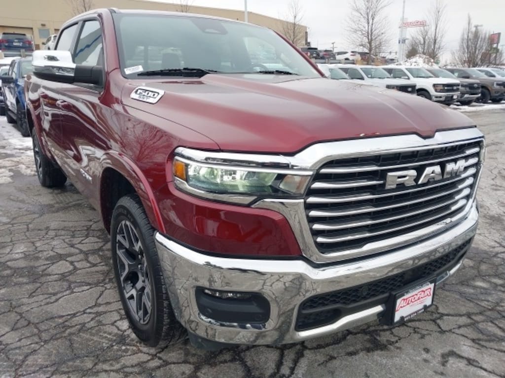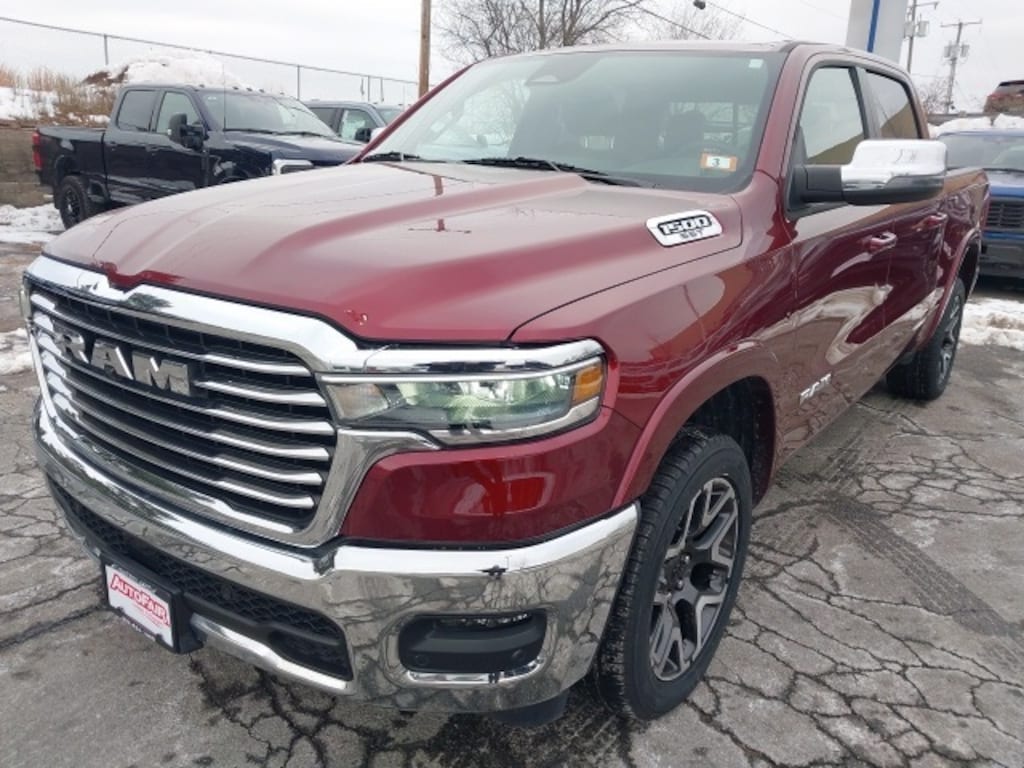 This 2025 Ram 1500 Laramie 4WD in striking Delmonico Red Pearlcoat combines refined style with powerful capability, powered by the 3.0L Hurricane I6 engine and paired with a 3.55 rear axle ratio for confident performance on any terrain. A CARFAX One-Owner vehicle with a Clean CARFAX, it comes equipped with the Laramie Level 1 Equipment Group and Quick Order Package 21H, featuring premium touches like chrome bumpers, 20" x 9" premium painted/polished wheels, and advanced technology including Uconnect 5 Nav with 12.0" display, Apple CarPlay/Android Auto, and a navigation system. Comfort and convenience are elevated with heated and ventilated front seats, heated rear seats, and a heated steering wheel, while features like rain-sensitive windshield wipers and remote tailgate release make everyday driving effortless.