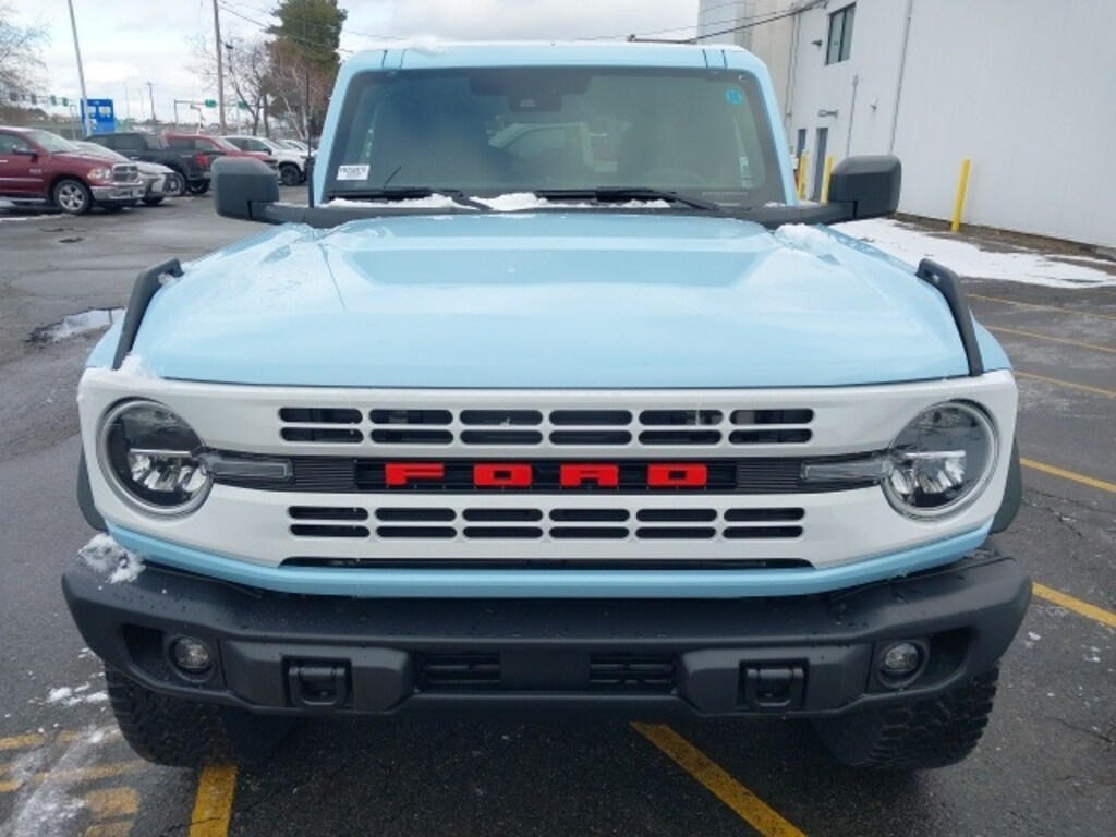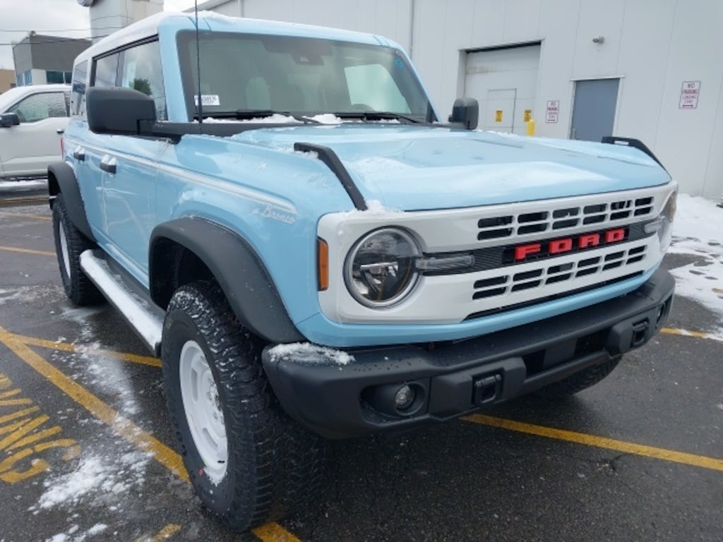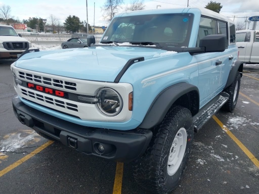 The **2025 Ford Bronco Heritage Edition** blends classic Bronco styling with modern performance and comfort, delivering a distinctive SUV experience. Its exterior features **17" unique white alloy wheels**, **Convertible HardTop with dual tops**, **hard top sound-deadening headliner**, **front fog lights**, **auto high-beam headlights**, **heated power mirrors**, and **glass rear window** for both style and functionality. Inside, the cabin combines rugged utility with refined touches, including **Plaid Cloth Front Heated Bucket Seats**, a **heated steering wheel**, **dual-zone automatic climate control**, and **front center armrest**. Technology and entertainment are abundant, with **SYNC 4**, **Connected Navigation**, **SiriusXM with 360L**, **AM/FM stereo**, and **7-speaker audio system**, along with convenience features like **illuminated entry**, **remote keyless entry**, **power windows**, and a **trip computer**.