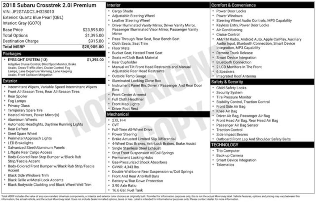 - EyeSight system with Blind Spot Detection/Rear Cross Traffic Alert, Pre-Collision Braking, and Adaptive Cruise Control