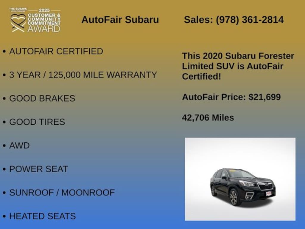 This Subaru Forester Limited is Autofair Certified, meaning it has undergone a rigorous inspection and comes with a 3-year/125,000-mile warranty for your peace of mind. With good brakes, good tires, and a wealth of advanced safety technologies, including Blind Spot Detection, Cross-Traffic Alert, and Lane Change Assist, you can drive with confidence knowing your safety is a top priority.