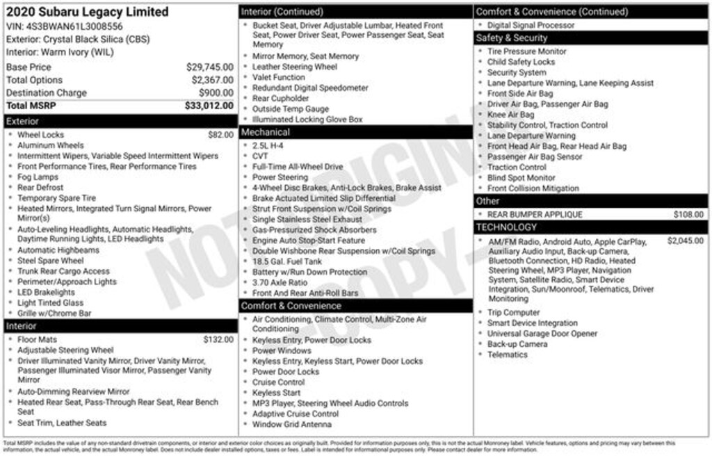 Experience the exceptional craftsmanship, performance, and technology of the 2020 Subaru Legacy Limited. Visit our showroom today and let us demonstrate how this remarkable sedan can elevate your driving experience.